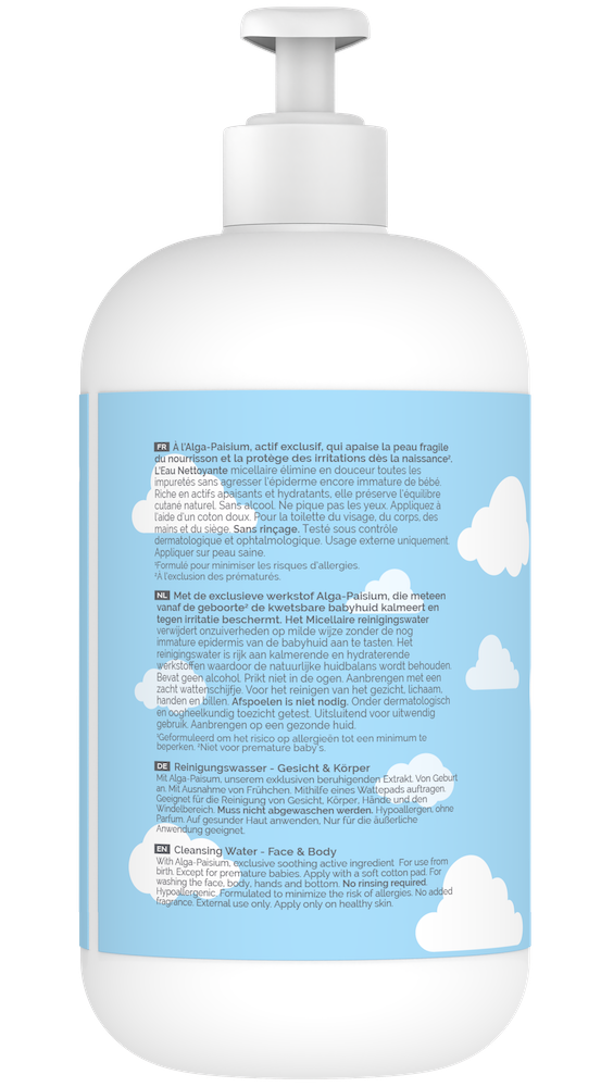 Dankzij een unieke combinatie van ingrediënten, waaronder Alga-Paisium, een exclusief extract van bruine algen, kalmeert en reinigt het Baby-reinigingswater zacht, waardoor de babyhuid zacht en comfortabel aanvoelt1.