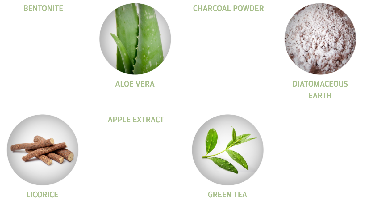 Ingrediënten: Aqua, Bentonite, Aloe Barbadensis Leaf Juice*, Glycerin, Polyglyceryl-2 Stearate, Charcoal Powder, Glyceryl Stearate, Stearyl Alcohol, Diatomaceous Earth, Camellia Sinensis Leaf Extract*, Glycyrrhiza Glabra Root Extract*, Pyrus Malus Fruit Extract, Potassium Sorbate, Sodium Benzoate, Benzyl Alcohol, Dehydroacetic Acid, Xanthan Gum, Parfum**