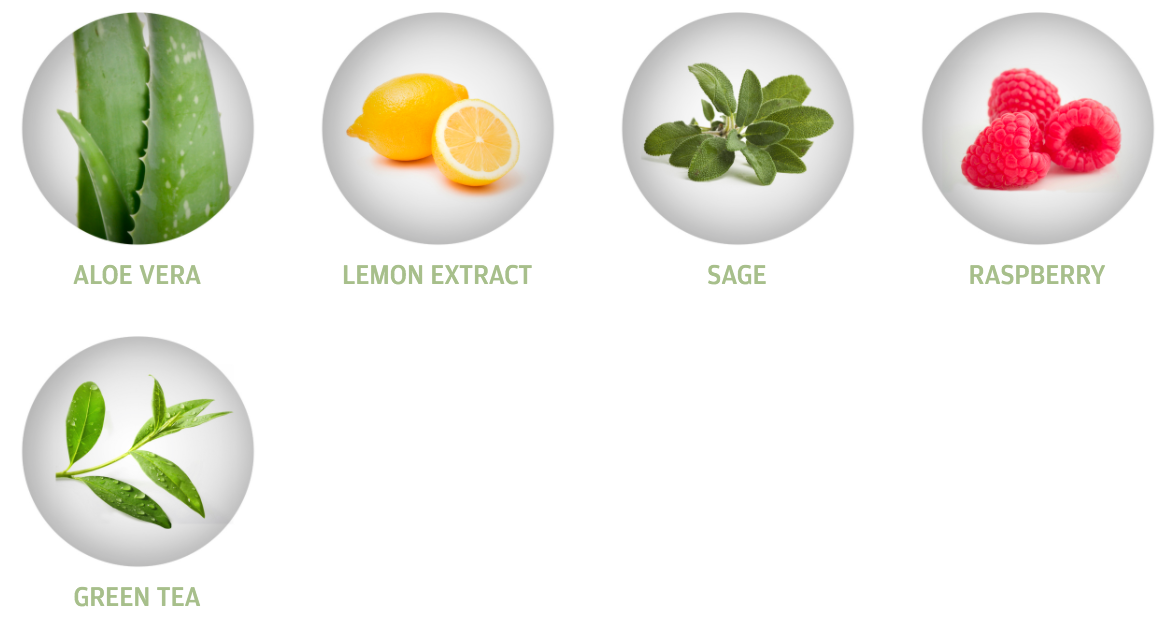 Citroen extract heeft een egaliserende werking op de huid, salie en aloë vera de huid zullen hydrateren en kalmeren.