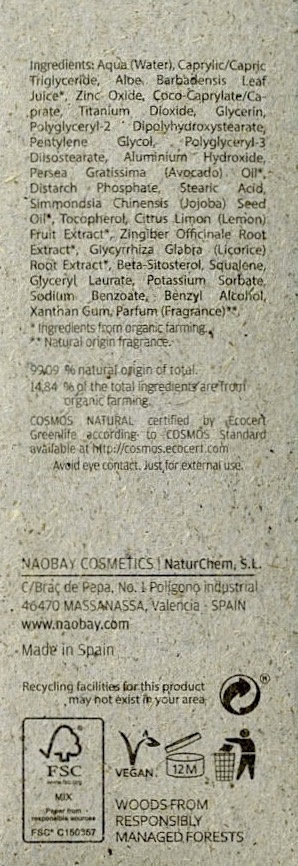 Ingrediënten: Aqua (Water), Aloe Barbadensis Leaf Juice*, Caprylic/Capric Triglyceride, Zinc Oxide, Titanium Dioxide, Coco-Caprylate/Caprate, Propanediol, Glycerin, Polyglyceryl-2 Dipolyhydroxystearate, Polyglyceryl-3 Diisostearate, Aluminium Hydroxide, Persea Gratissima (Avocado) Oil*, Stearic Acid, Simmondsia Chinensis (Jojoba) Seed Oil*, Glycine Soja Oil, Tocopherol, Citrus Limon (Lemon) Fruit Extract*, Zingiber Officinale Root Extract*, Glycyrrhiza Glabra (Licorice) Root Extract*, Beta-Sitosterol, Squalene, Potassium Sorbate, Sodium Benzoate, Citric Acid, Xanthan Gum, Benzyl Alcohol, Parfum (Fragrance)**.