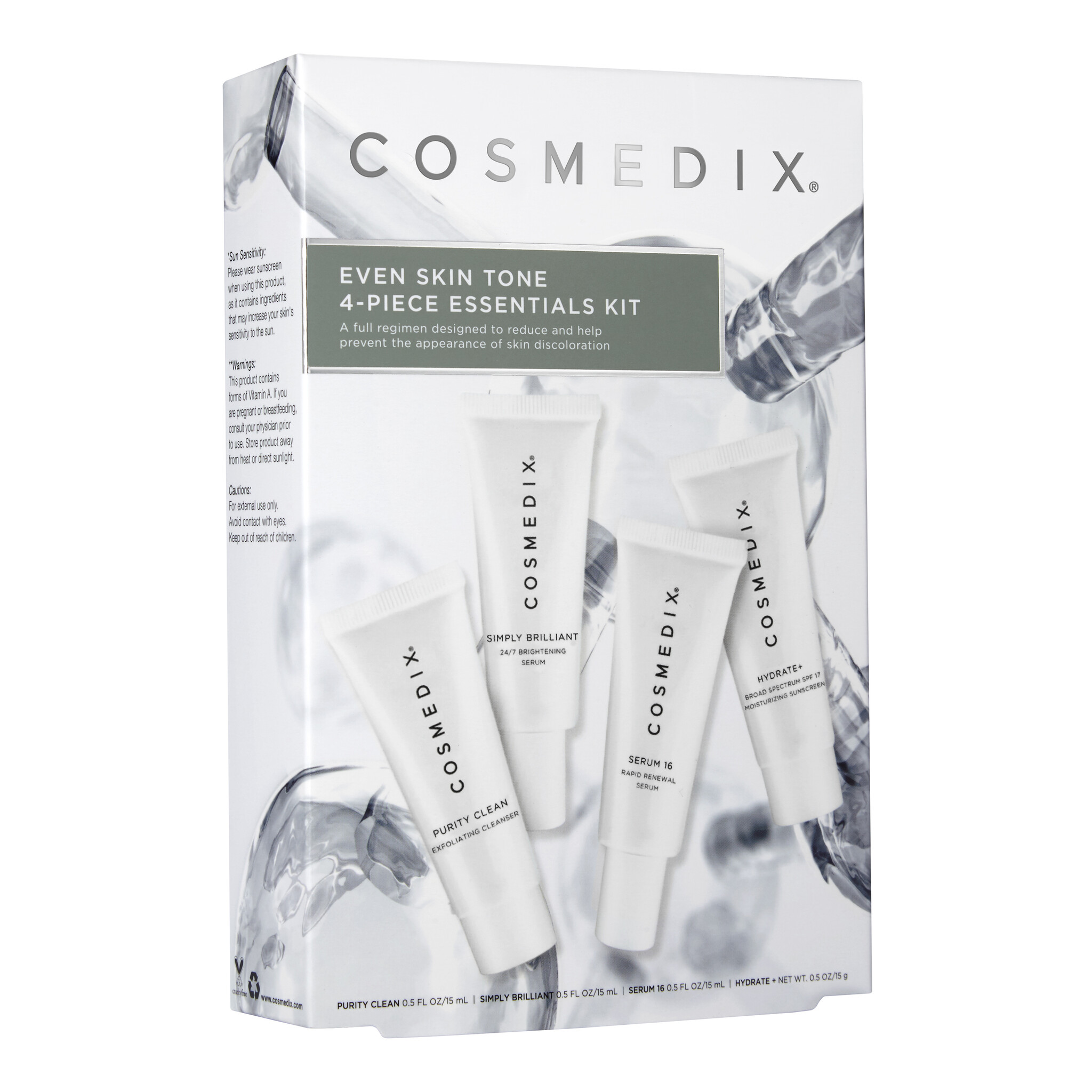 De Even Skin Tone Kit bevat Purity Clean, Simply Brilliant, Serum 16 en Hydrate+. Een perfecte kit voor de droge, gevoelige huid waarbij de focus ligt op hyperpigmentatie. Perfecte en vereiste voorbereiding op de Professionele Cosmedix Peelings.