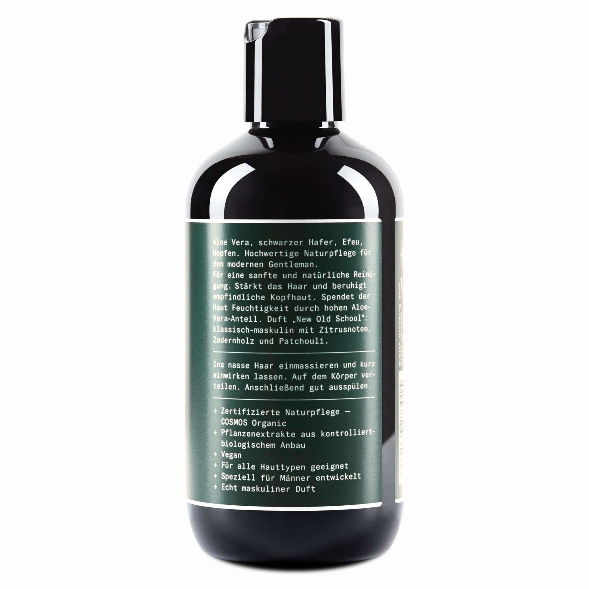 De Shampoo + Body Wash is geschikt voor het douchen en voor het dagelijks wassen van het haar. De romige, gelachtige consistentie en natuurlijke oppervlakteactieve kokosnoot reinigen de huid en het haar op milde wijze en zorgen ervoor dat het opnieuw wordt geolied. Het hoge gehalte aan aloë vera voorkomt dat de huid uitdroogt. Zwarte haverextract en lecithine versterken, regenereren en versterken het haar. Door de goede huidtolerantie is het product geschikt voor alle huid- en haartypes. "New Old School" geur: klassiek mannelijk met tonen van citrus, cederhout en patchouli.