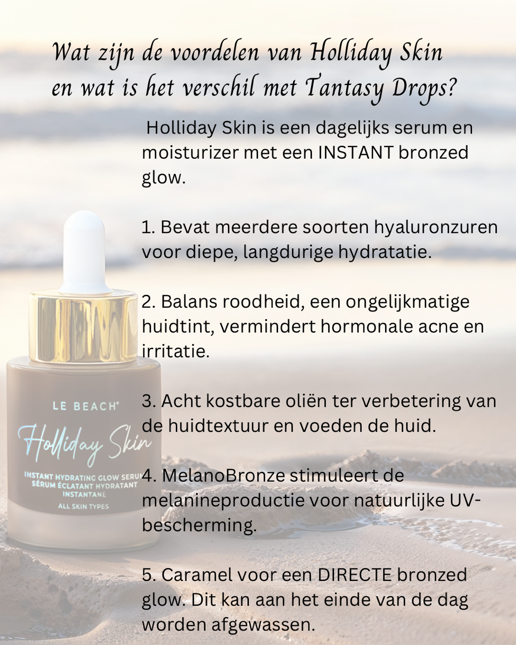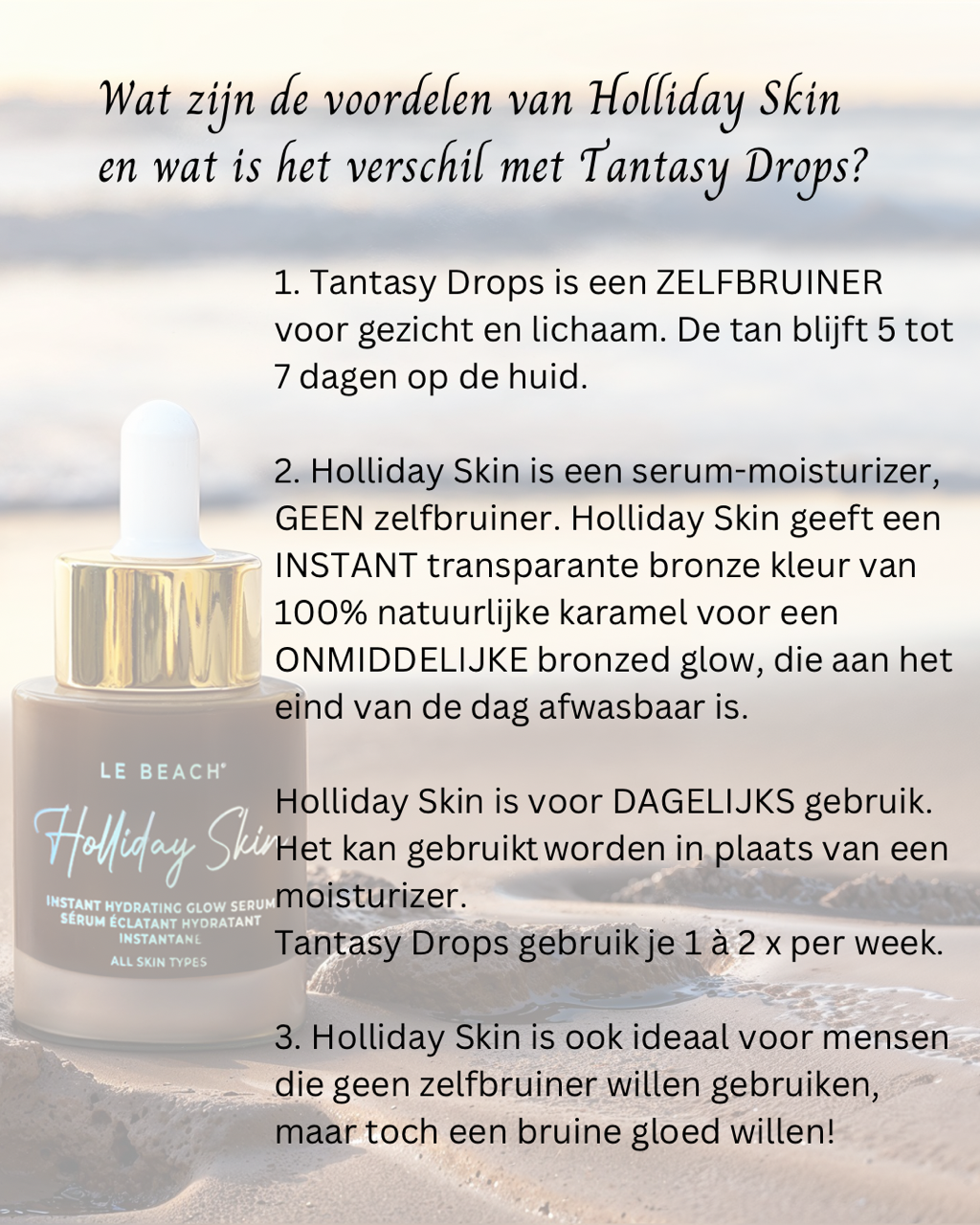 Holliday Skin is een must-have voor iedereen die elke dag een gezonde Radiant BEACH-gloed wil! Ervaar de ultieme innovatie op het gebied van huidverzorging: een serum, vochtinbrengende crème en instant bruining in één. Ontdek Holliday Skin vandaag nog!