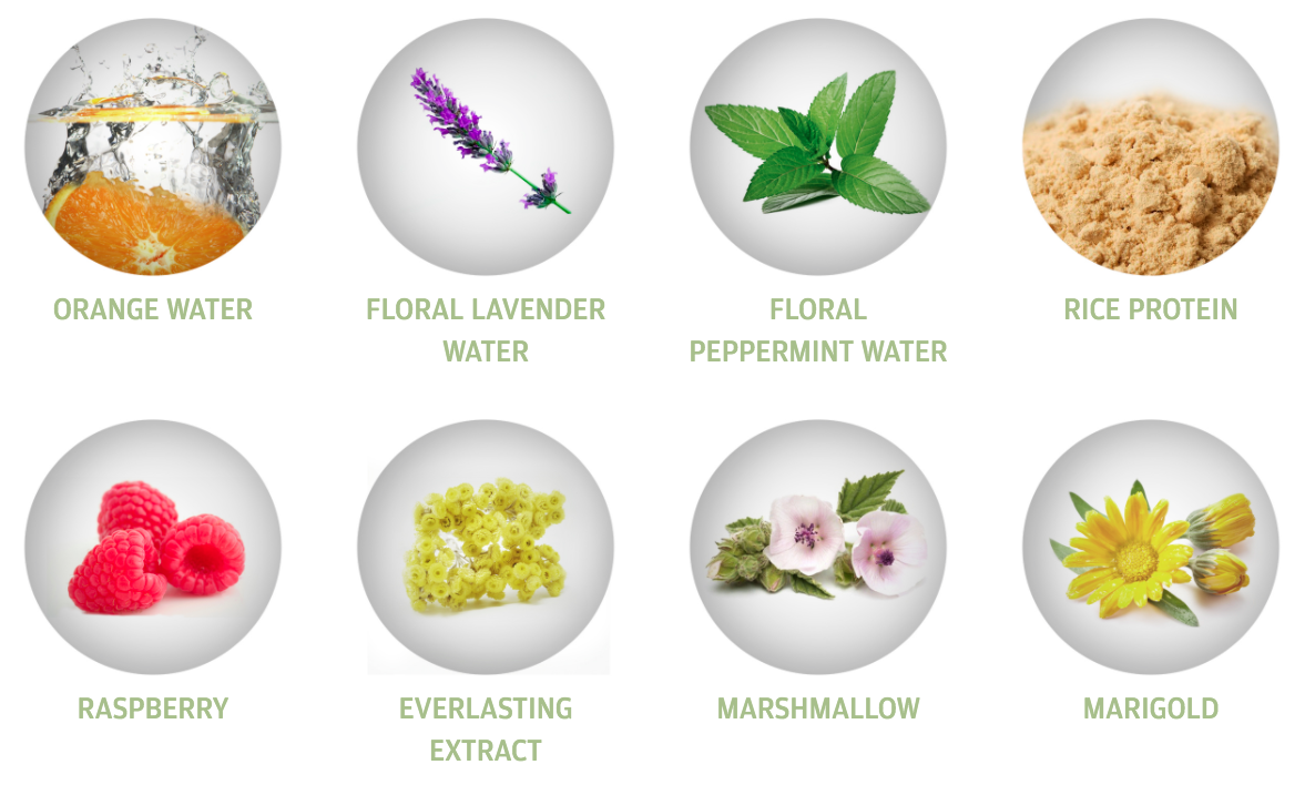 Ingrediënten: Aqua, Aloe Barbadensis Leaf Juice*, Glycerin, Propanediol, Lavandula Angustifolia Flower Water*, Mentha Piperita Leaf Water*, Hydrolyzed Rice Protein, Citrus Aurantium Dulcis Fruit Water*, Rubus Idaeus Fruit Extract*, Helichrysum Stoechas Flower Extract*, Althaea Officinalis Root Extract*, Calendula Officinalis Flower Extract*, Potassium Sorbate, Sodium Benzoate, Cellulose Gum, Citric Acid, Parfum**, Limonene**, Linalool**