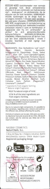 Ingrediënten: Aqua, Citrus Aurantium Dulcis Fruit Water*, Glycerin, Bentonite, Oryza Sativa Oil*, Stearyl Alcohol, Coco-Caprylate/Caprate, Caprylic/Capric Triglyceride, Perlite, Zinc Oxide, Papaver Somniferum Seed Oil*, Polyglyceryl-2-Stearate, Prunus Armeniaca Kernel Oil*, Cyperus Esculentus Root Oil*, Glyceryl Stearate, Hordeum Vulgare Seed Extract, Rubus Idaeus Fruit Extract*, Chamomilla Recutita Flower Extract*, Citrus Limon Fruit Extract*, Althaea Officinalis Root Extract*, Helichrysum Stoechas Flower Extract*, Titanium Dioxide, Benzyl Alcohol, Potassium Sorbate, Sodium Benzoate, Dehydroacetic Acid, Xanthan Gum, Cellulose Gum, Parfum, Citric Acid, Citral, Geraniol, Limonene, Linalool.