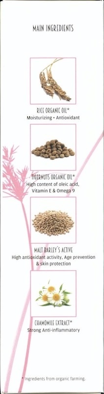 Bevat verzachtende en verfrissende bestanddelen zoals oranjebloesemwater, vitamine E en een combinatie van hydraterende rijst en abrikozenolie, die de vetzuren van de huid herstellen.