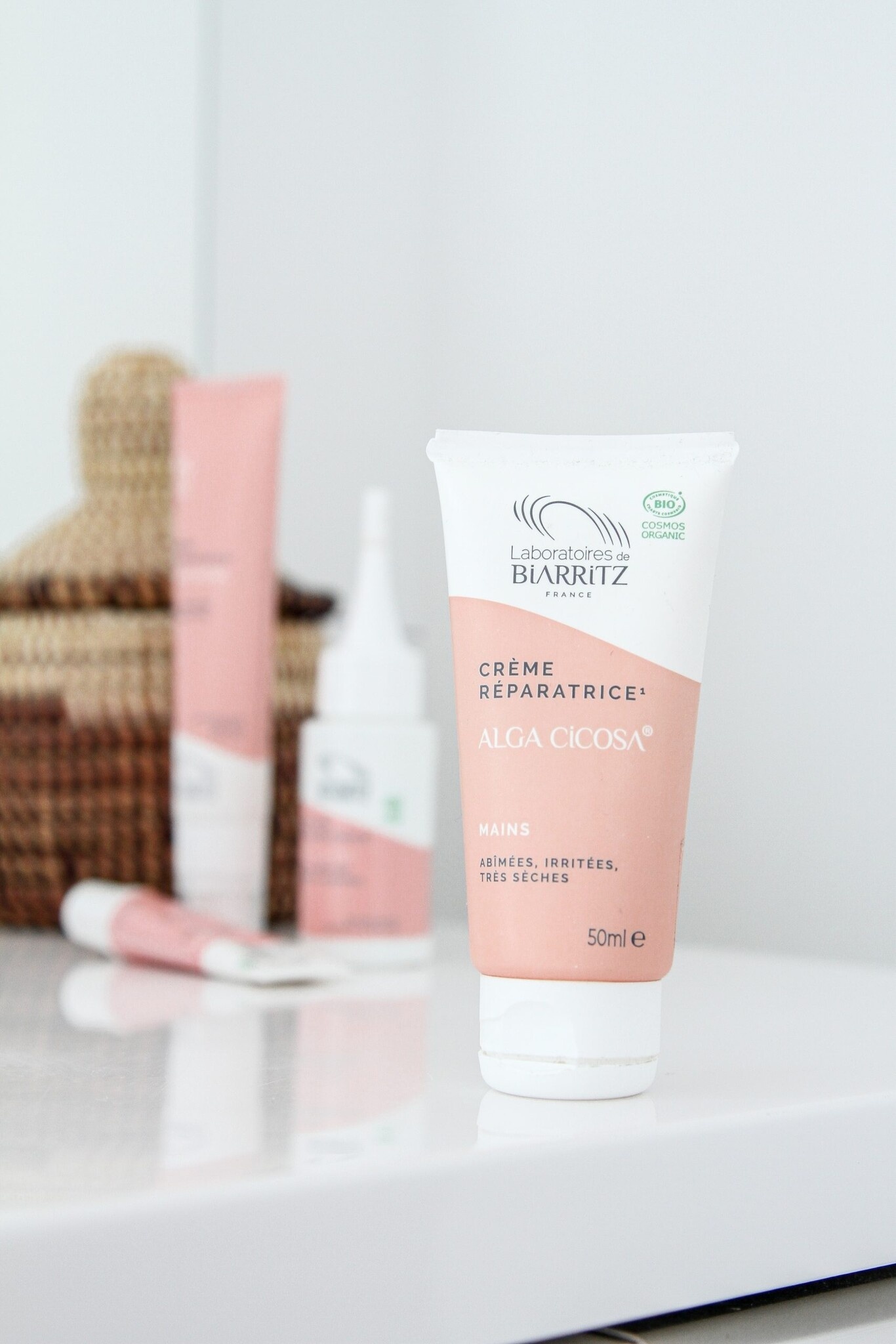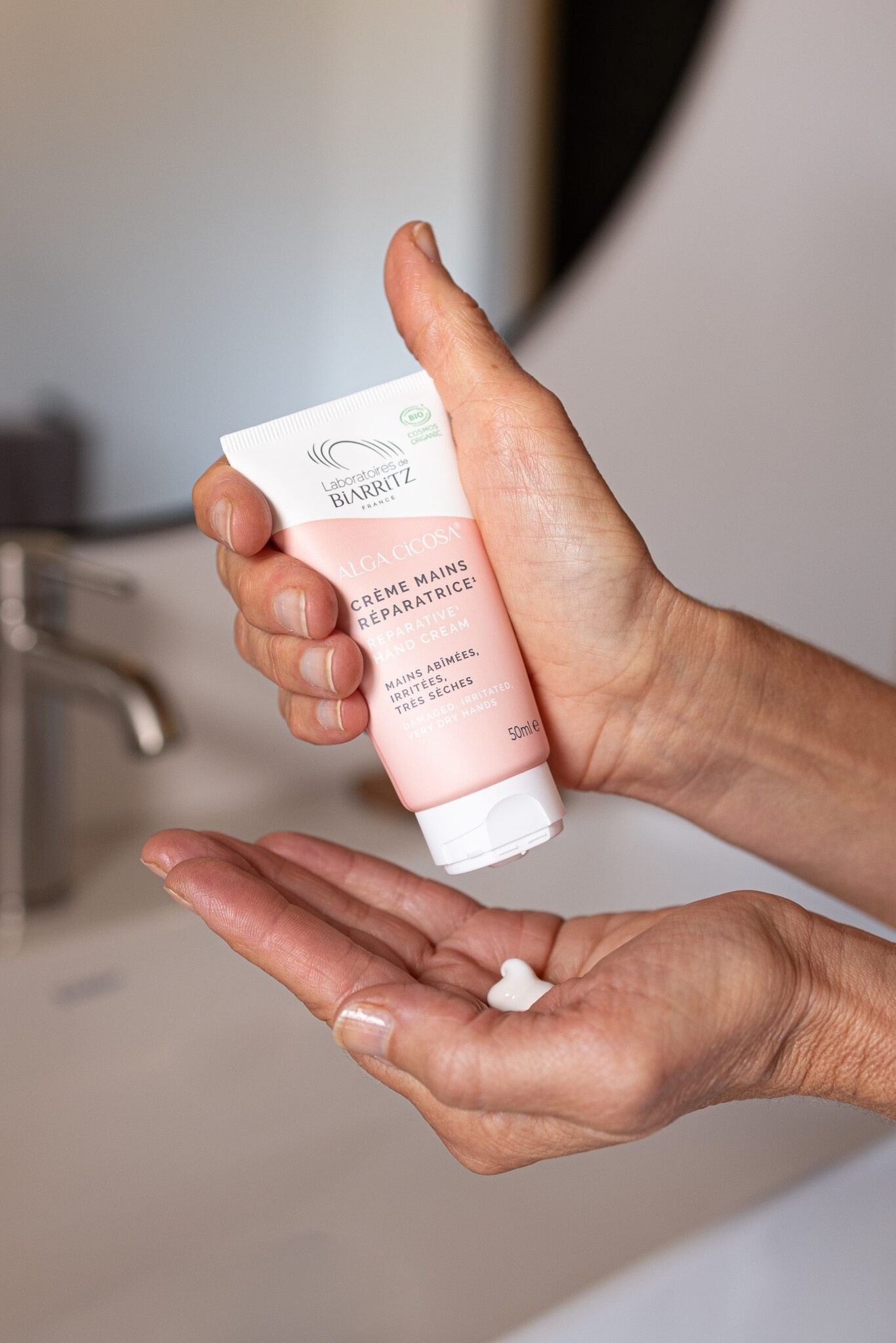 Laat je handen genieten van de kalmerende en herstellende kracht van de dermatologisch geteste Reparative Cream, een huidverzorgingslijn die hypoallergeen is. Deze handcrème bevordert niet alleen het herstel van beschadigde handen, maar maakt de huid ook zijdezacht. Het rode zeewier extract kalmeert de huid onmiddellijk en vormt vervolgens een beschermende barrière tegen uitdroging. Dankzij de rijke en isolerende formule, verrijkt met hydraterende en voedende ingrediënten (biologische aloë vera, biologische plantaardige oliën, biologische sheaboter), versterkt de biologische herstellende1 crème voor de handen de zuurmantel van de huid en vormt een beschermlaag. De handen zijn hersteld1, zacht, langdurig gehydrateerd en beschermd2.