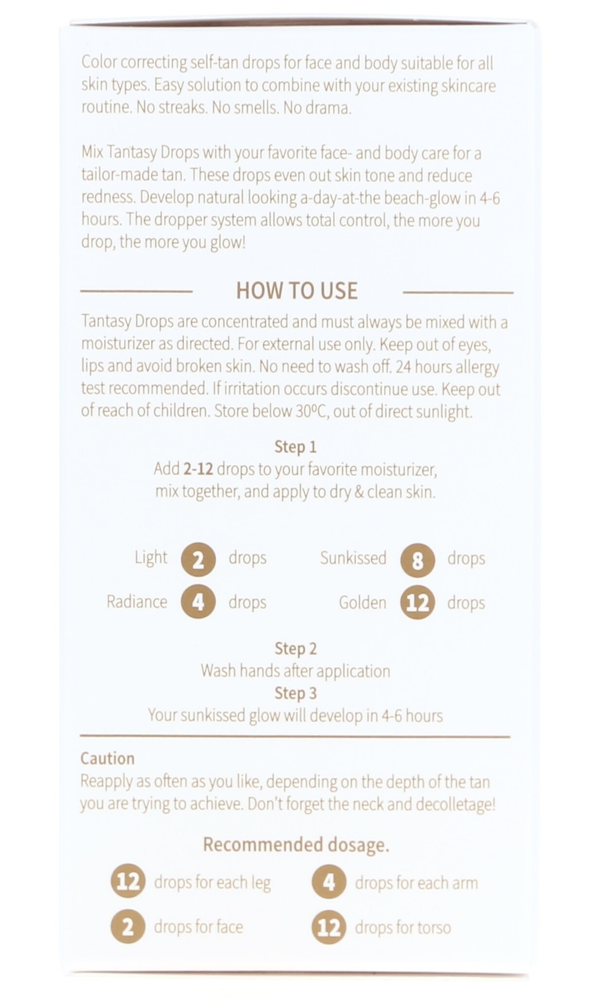 Hoe gebruik je Tantasy Drops? Breng ze zo vaak aan als je wilt, afhankelijk van de diepte van de teint die je wilt bereiken. Vergeet niet je hals en decolleté mee te nemen voor een perfecte overgang. Houd je aan de aanbevolen maximale dosering per week: 12 druppels voor het lichaam, 12 druppels per been, 4 druppels per arm en 4 druppels voor het gezicht. Deze druppels zijn geconcentreerd, dus meng ze altijd met een vochtinbrengende crème volgens de instructies.