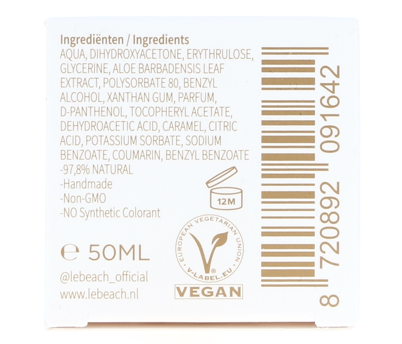 Ingrediënten: AQUA (WATER)*, DIHYDROXYACETONE (Sugar Derived)*, ERYTHRULOSE*, GLYCERIN (Organic Vegetable Derived)*, ALOE BARBADENSIS LEAF EXTRACT*, BENZYL ALCOHOL (Natural essential oil)*, XANTHAN GUM**, TOCOPHERYL ACETATE (Vitamin E)**, PANTHENOL (Vitamin B)**, PARFUM (Natural fragrance), DEHYDROACETIC ACID***, CARAMEL (Sugar Derived)* CITRIC ACID (Citrus Fruit Derived)* POTASSIUM SORBATE*, SODIUM BENZOATE**, SODIUM HYDROXIDE**, COUMARIN*, BENZYL BENZOATE (Natural essential oils)*