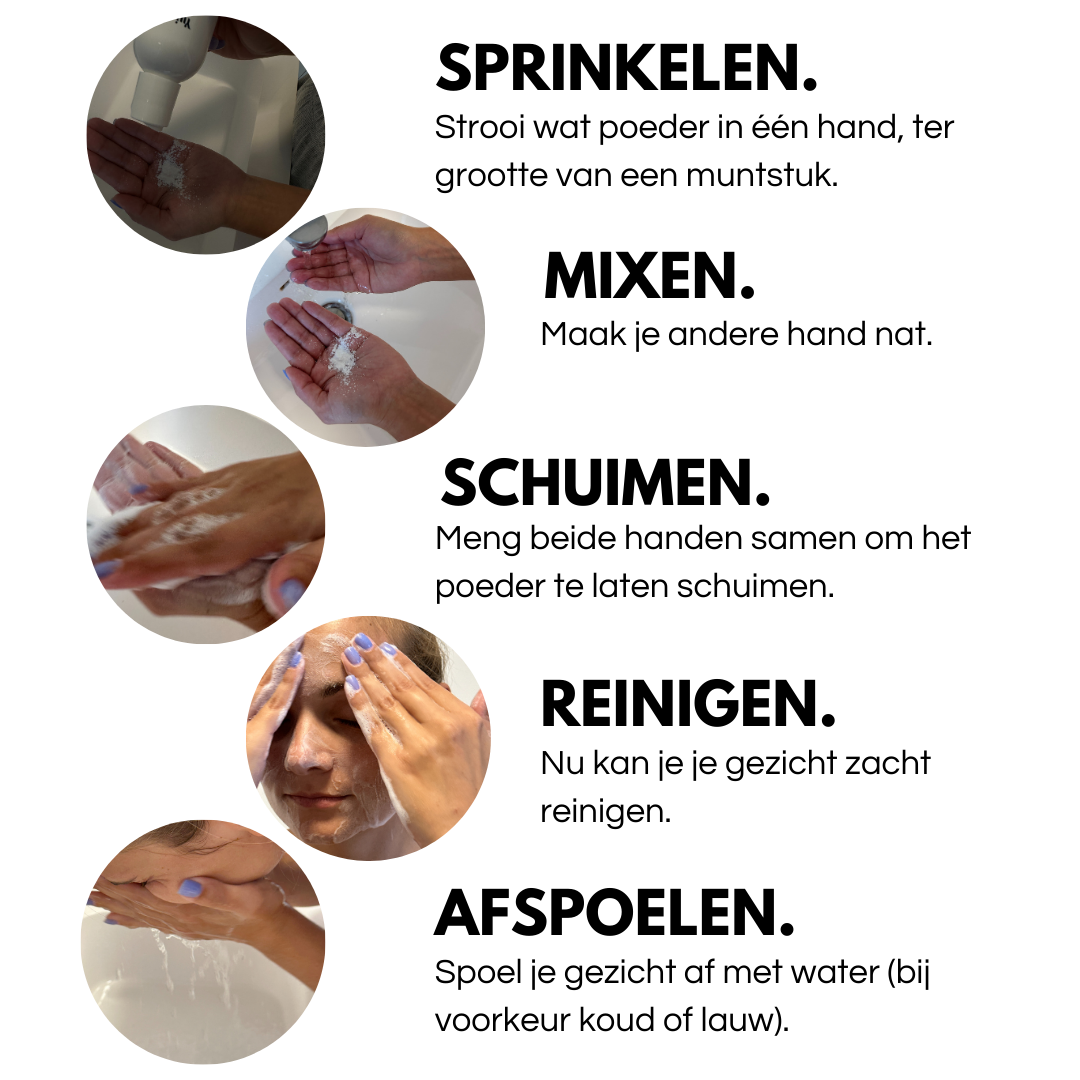 Een zijdezacht poeder dat met water wordt geactiveerd tot luxueuze schuimende bubbels.